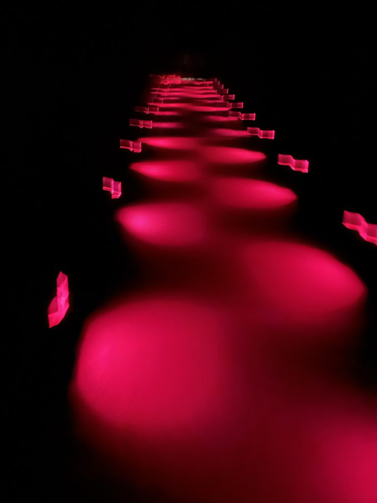 光と水と音の幻想的な空間。五感の体感型アート。その一角に地獄へと通ずる道がある。とても幻想的で美しいエリアから一変。その道は突如現れた。音は低く、遠くにポンッと水の落ちる音が響くだけ。光が私達を誘う。美しい赤。怪しい赤。危険信号の赤。黒い通路に灯る赤は足元を照らしてくれた。でも、それが足を燃やしている火にも見えて、天国から落とされた様な感覚に陥る。何故楽園に留まらなかった?何故あの場から逃げた?その火は私を攻め立てるように疑問をぶつけた。答えは簡単で『もっと』と欲に眩んだから。そして、『この先にはどんな物が?』と好奇心が働いてしまったから。貪欲な人間の醜さが知識欲と現状に満足させなかったのだ。きっと、私にこう問いかけて来たのは、光と音の便りだったのかもしれない。これも私の勝手な妄想。自分の都合の良い様に解釈してしまうのは良くない事ね。