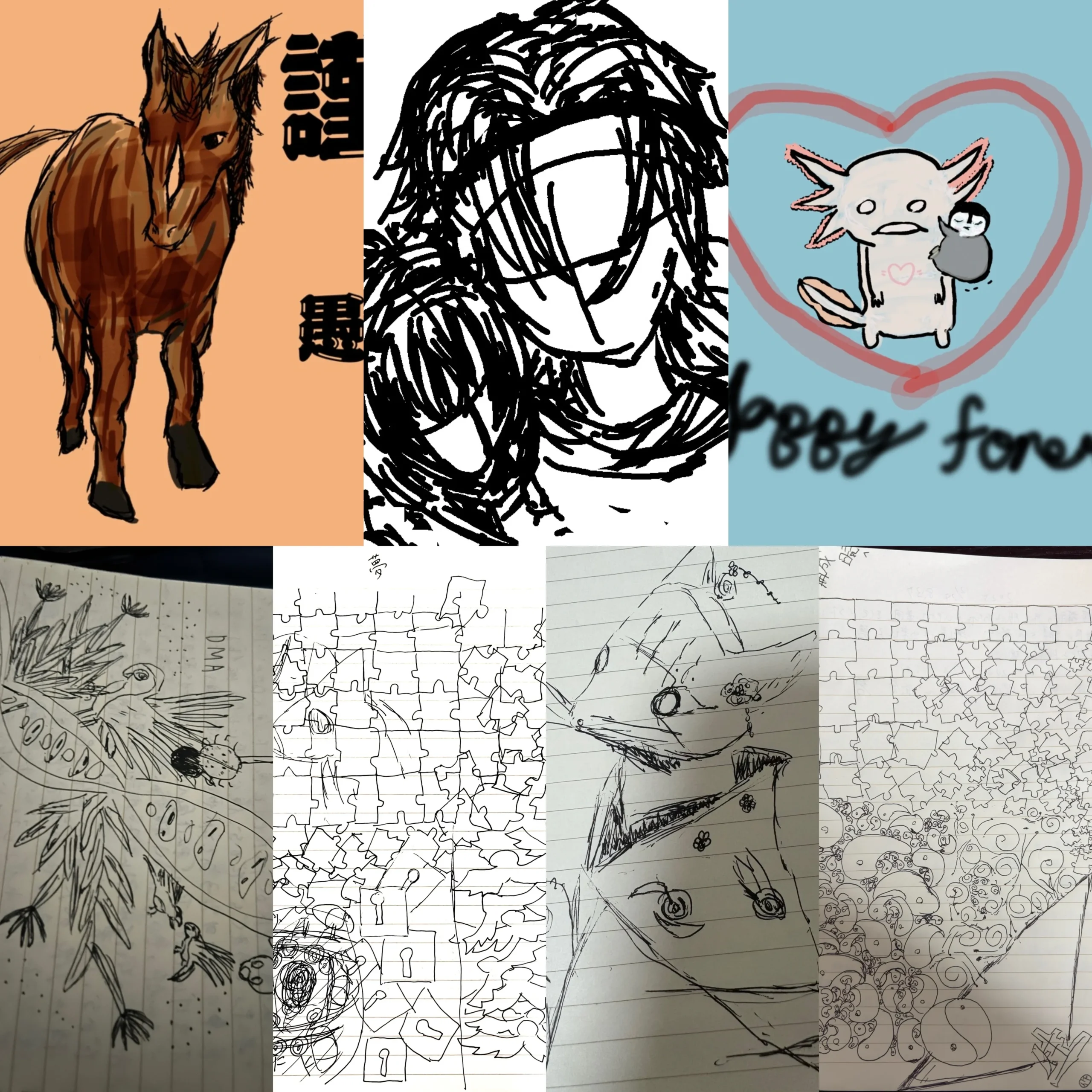 まーちゃんは、デジタルPhotoshopからWindowsの普通のお絵描きツールまでやるし、アナログならノートに普通に色んな絵を描いてる、お絵描き専門特化型の子。過去中学一年生で国際版画美術館で点描画を展示されたことがある子。最近になってやっと、描けるようになってきたんよ。